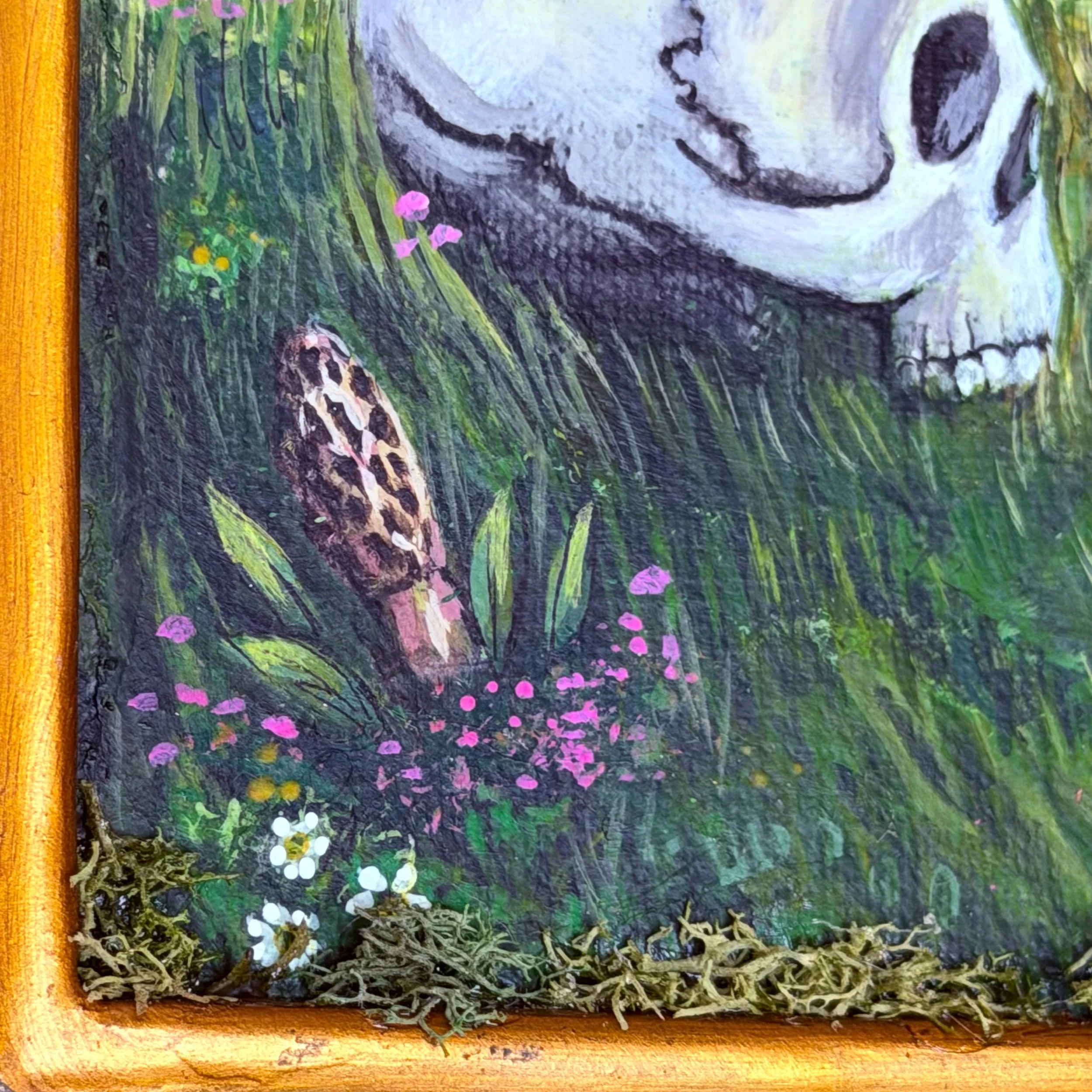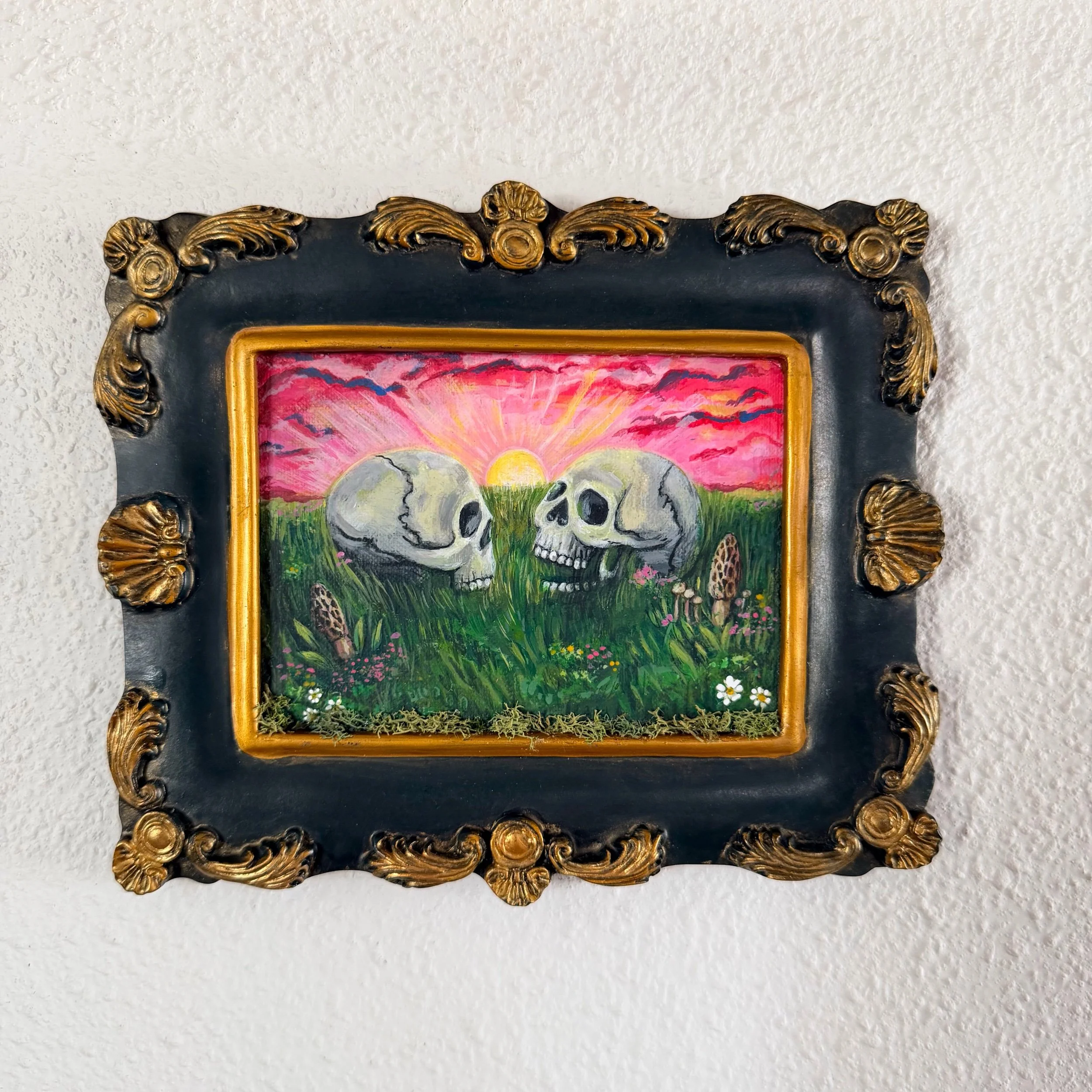 I have been meaning to use this little frame for quite some time! I love thrifting frames and bringing them new life. I took canvas paper and painted two skulls with a beautiful sunset and flowers and some morels. I then restored the gold parts on the frame, it just looks so much better. I attached the canvas paper on cardboard and pink felt with a flexible wire for hanging (E6000 Industrial adhesive). The piece is sealed with a matte finish to prevent it from chipping or fading.